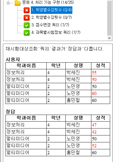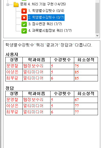 쿼리 결과 값이 다르네요. 쿼리 작성에는 문제가 없고 데이터 부분에서 정답 파일과 다른 것입니다.