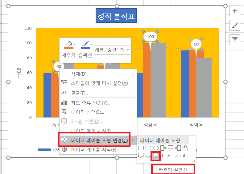 데이터레이블을 표시한 뒤 그림과 같이 말풍선을 만드는 방법을 모르겠습니다