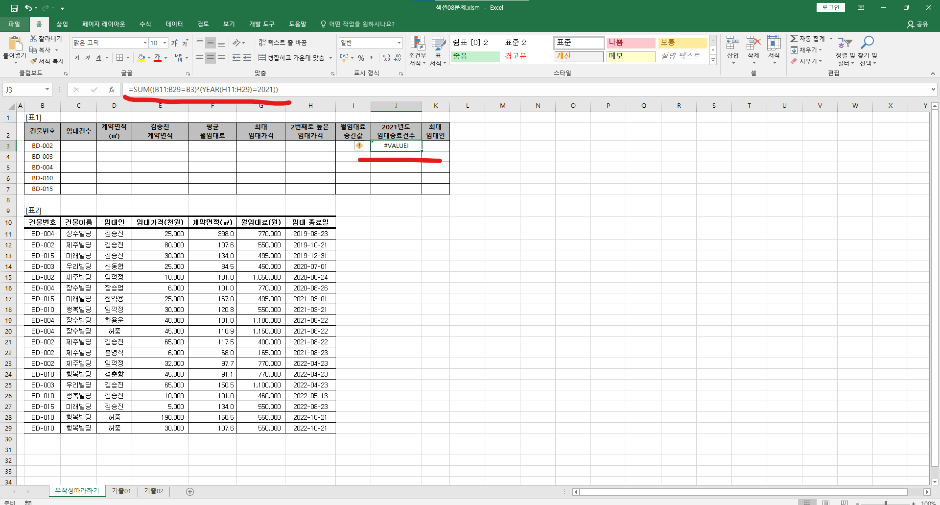 J3셀에 수식을 입력하고 컨트롤 + 쉬프트 + 엔터를 누르면 #value 오류가 뜹니다.