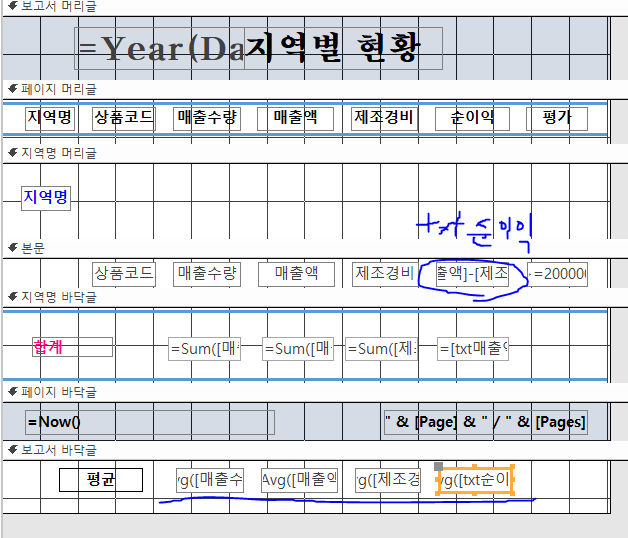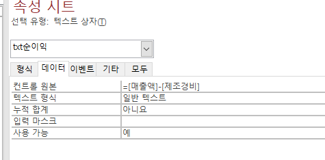 보고서 바닥글에 매출액, 제조경비, 순이익의 평균을 구하는 식을 써야하는데 순이익 평균부분에 책에서처럼 Avg([매출액]-[제조경비])를 입력하면 정상 작동은 되는데, 왜 Avg(txt순이익)을 입력하면 매개변수 입력 메세지 창이 뜨는건지 궁금합니다!