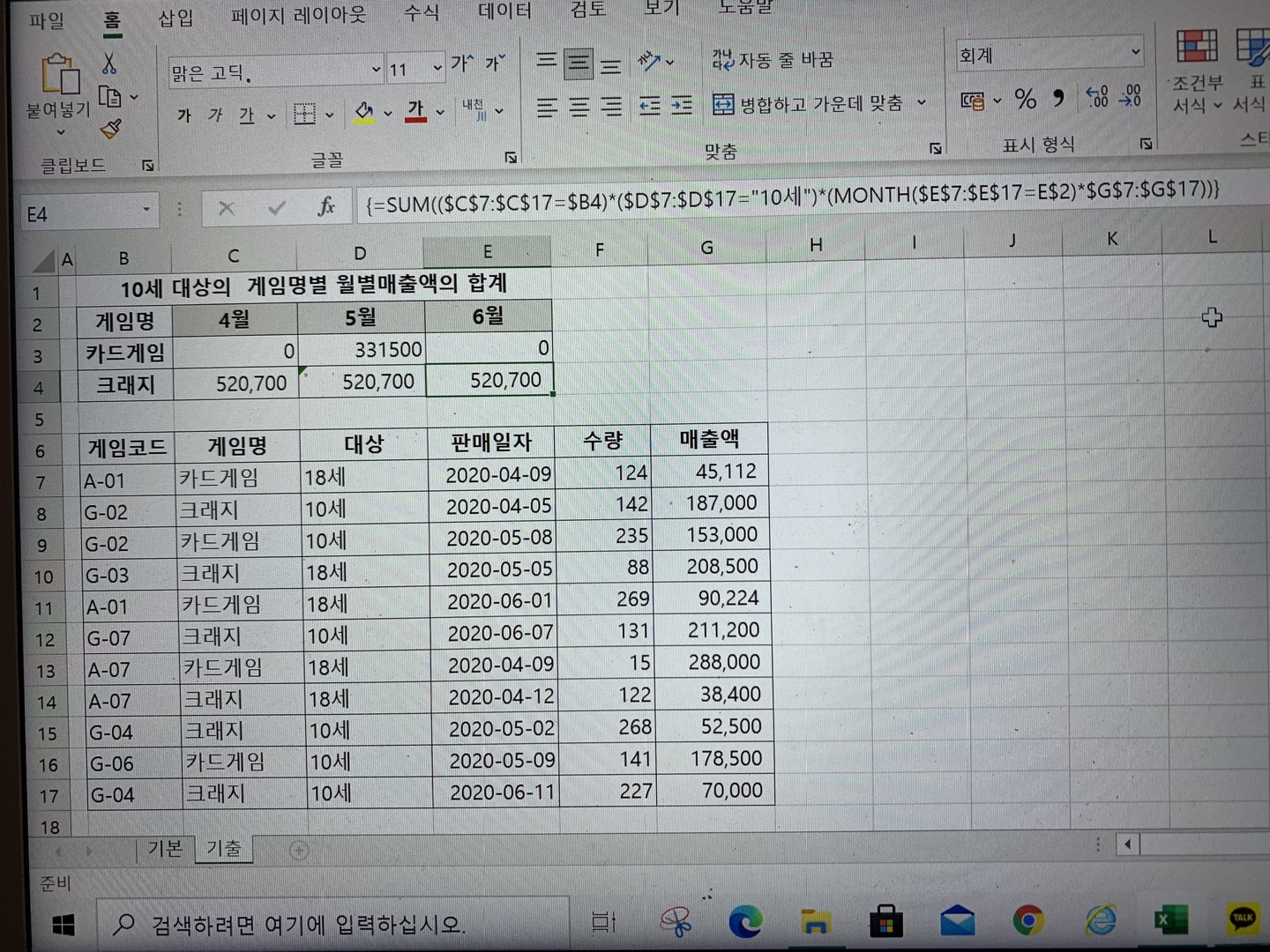 1. =SUM(($C$7:$C$17=$B3)*(MONTH($E$7:$E$17)=E$2)*($D$7:$D$17="10세")*$G$7:$G$17)