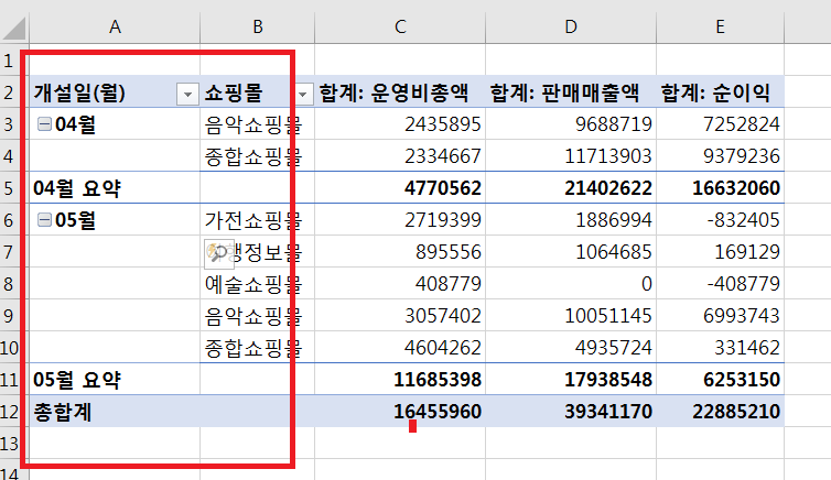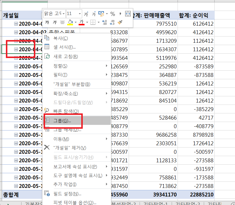아래그림과 같이 개설일에서 오른쪽 클릭-> 그룹을 지정하세요.