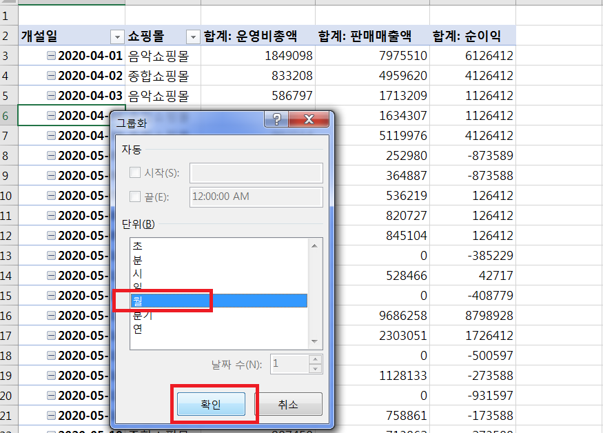 혹시 저 피벗테이블의 년월 기간 그룹 추가 지정하는 방법도 알 수 있을까요?