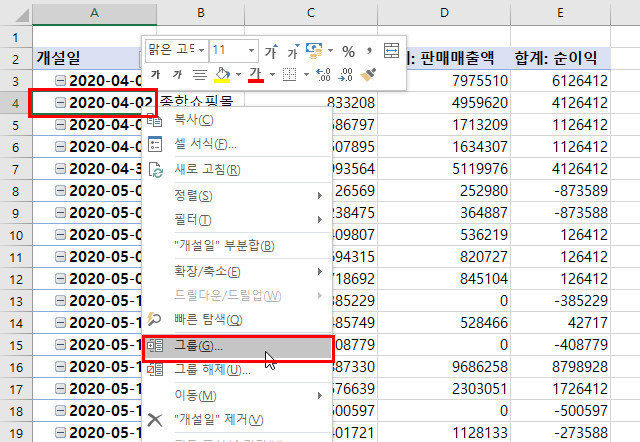 말씀하신 날짜데이터를 선택한 뒤 그룹 지정이 안됩니다
