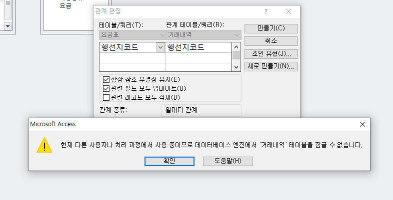 해당하는 개체, 즉 테이블이나 쿼리가 열려져 있는 경우 나타나는 메시지 입니다. 다른 개체들을 다 닫은 후 관계를 설정하세요.