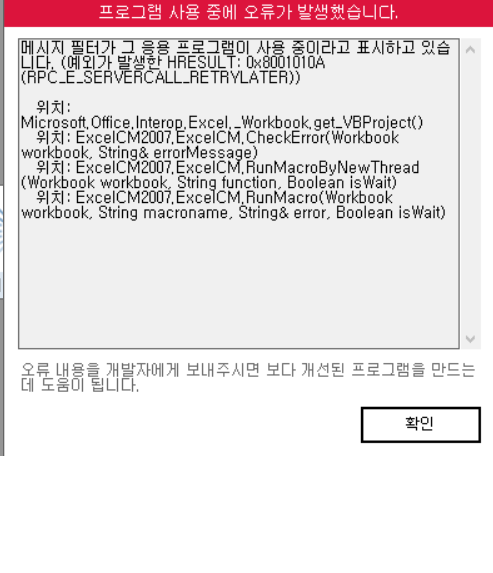 문의하신 오류는 엑셀프로그램의 비주얼베이직 기능에 문제가 발생해 오류 메시지가 나타난 것으로 보입니다.