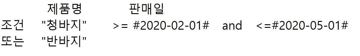 위와 같이 조건을 지정하면 제품명이 "청바지"이고 판매일이 2020-02-01부터 2020-05-01 사이인 제품이거나, / 제풍명이 "반바지"인 데이터를 추출하는 것입니다.