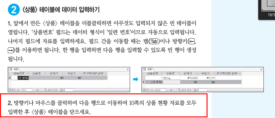 19쪽에 보면 10쪽의 상품 현황 자료를 모두 입력한 후 <상품> 테이블을 닫으세요. 라고 되어있습니다. 그런데 님은 <상품> 테이블에 데이터를 모두 입력하지 않았기때문에 <판매내역> 테이블에 데이터가 입력되지 않은 것입니다. <상품> 테이블과 <판매내역> 테이블은 관계를 설정했기 때문에 <판매내역> 테이블에는 <상품> 테이블에 입력된 상품만을 입력할 수 있는데, <상품> 테이블에 상품번호 1번만 입력했기때문에 상품번호 1번에 해당하는 Wing 외에 다른 데이터를 입력할 수 없습니다. <상품> 테이블에 데이터를 모두 입력한 상태에서 <판매내역> 테이블에 데이터를 입력해 보세요.