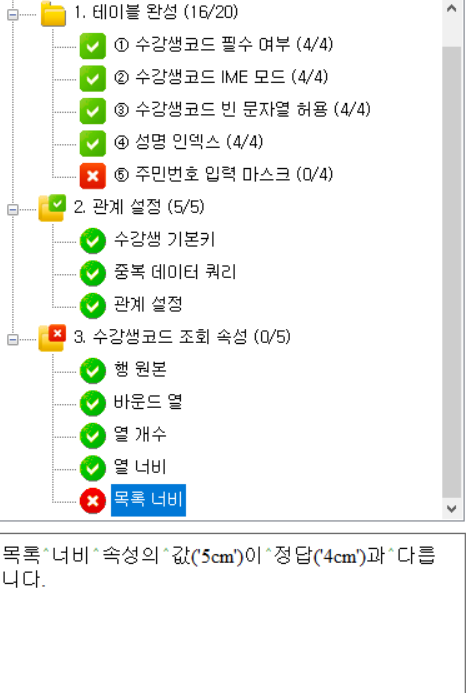 1-3번 문제에서 열너비, 목록 너비를 알맞게 지정 하라는데 그림 보면서 대충 열너비는 2cm,2cm로 하였고 목록너비는 5cm로 하였는데 채점프로그램은 목록너비가 4cm라고 하면서 오답처리 되었습니다. 정확하게 답지에 나와있는 답을 입력해야 정답으로 인정되는 것인가요??? 빠른 답변 부탁드립니다 ㅠㅠ