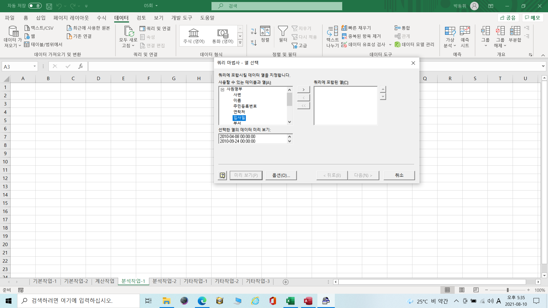 컴퓨터활용능력 1급 실기 기본 모의고사5회에서 문제 3 외부 데이터 가져오기 기능을 사용하면 입사일이 엑세스 원본 파일과 다르게 나옵니다. 엑세스에는 입사일이 2014년부터 시작하지만 데이터 가져오기 기 데이터를 미리보면 입사일이 2010년 부터 시작합니다. 시험장 따라하기를 할 때도 년도가 다르게 나오는 이러한 오류가 있었습니다. 어떤 부분이 잘못된건지 궁금해서 문의 드립니다.