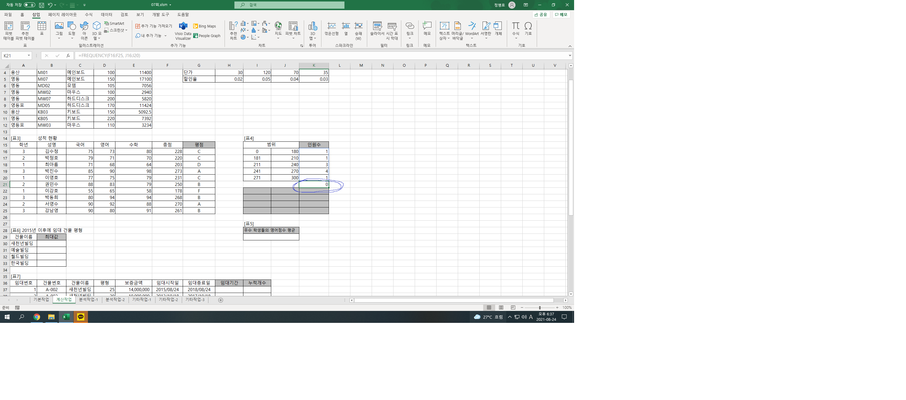 3번 문제에서 K16:K20 결과셀을 블록하고 정답 수식을 입력하면 결과가 다음과 같이 자동으로 완성됩니다. 위에 수식줄에 따로 작성하려고 하면 빈칸으로 사라집니다.