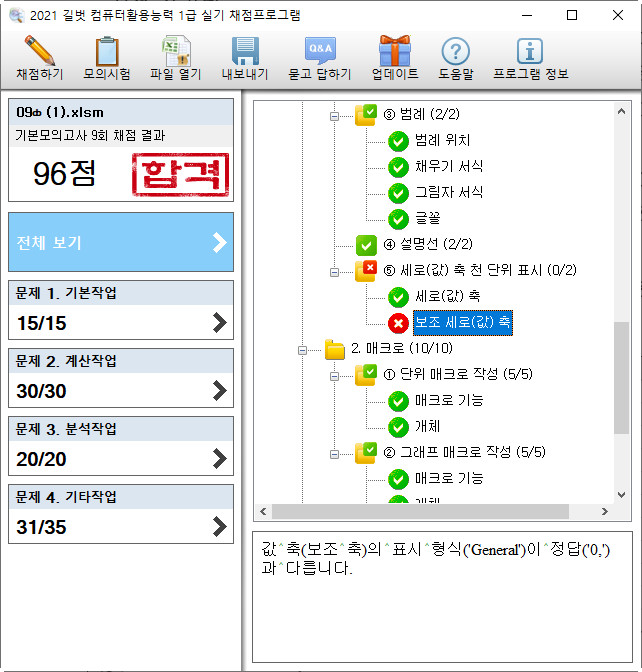 올려주신 파일을 채점했는데, 평균단가 추가는 맞는 것으로 나옵니다. 틀린 것은 5번으 보조 세로 축의 셀 서식을 지정하지 않아서 감점된 것으로 나옵니다. 다시 한번 확인 부탁드립니다.