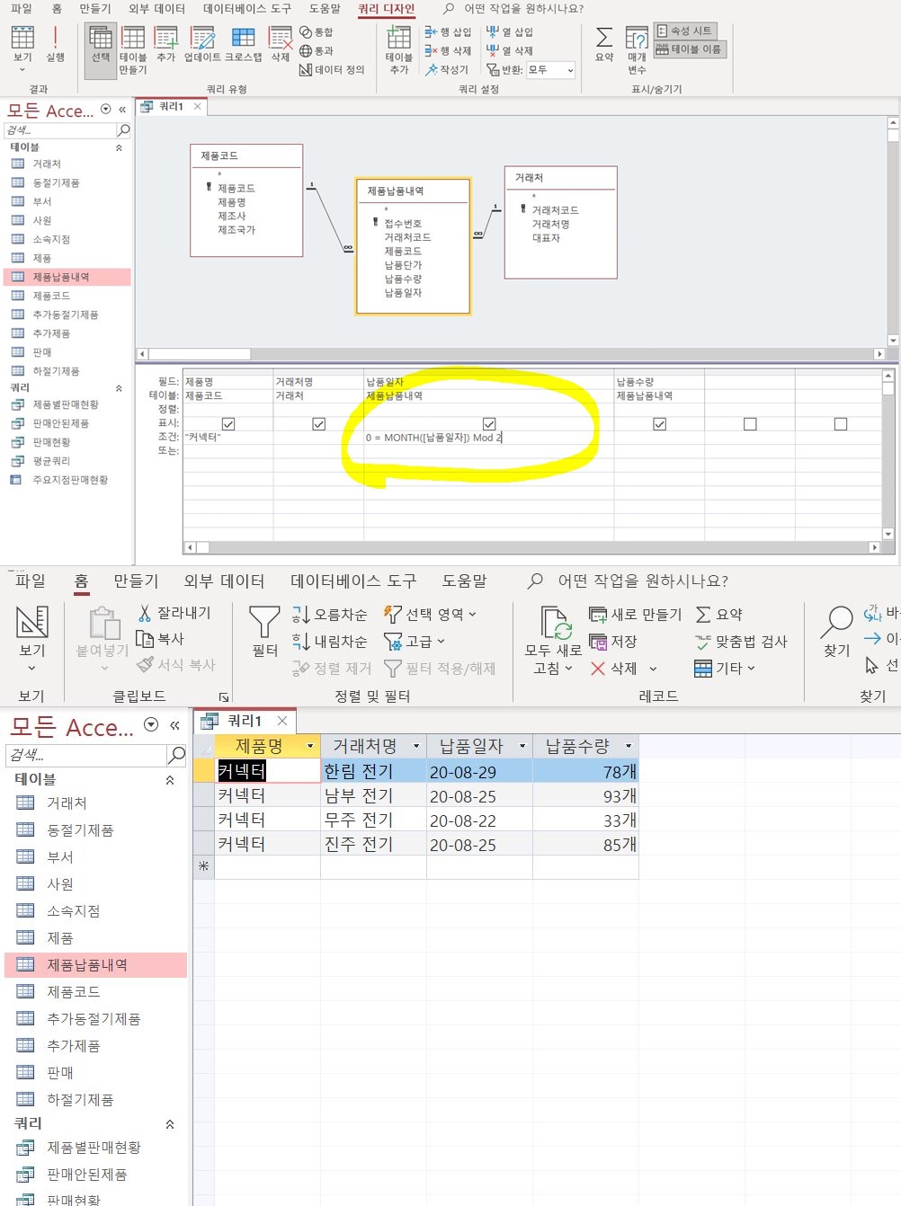 ▶ 납품월이 짝수 달인 경우만 표시할 것 (Month, Mod 함수 이용)