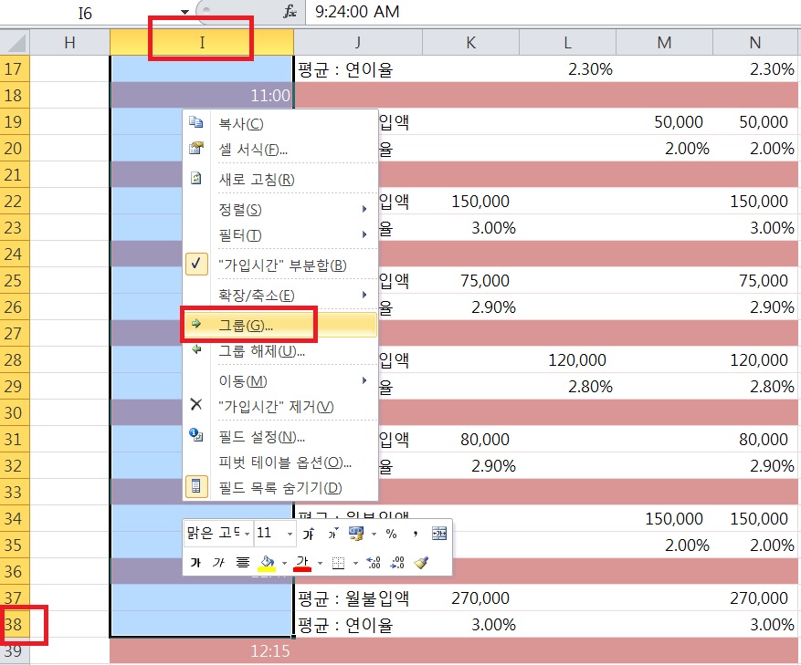 그리고 그룹화를 지정할 때 주어진 형식 내에서만 가능하게끔 나오는데 버전이 달라 그런건지 어떻게 해야 시/분이 같이 표시되고 오전/오후로 그룹화할 수 있을까요 ㅠㅠ
