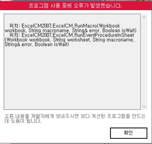 또한, 해당 오류는 윈도우 환경 문제로 비쥬얼 베이직 쪽에서 오류가 발생한 것으로 보여집니다.