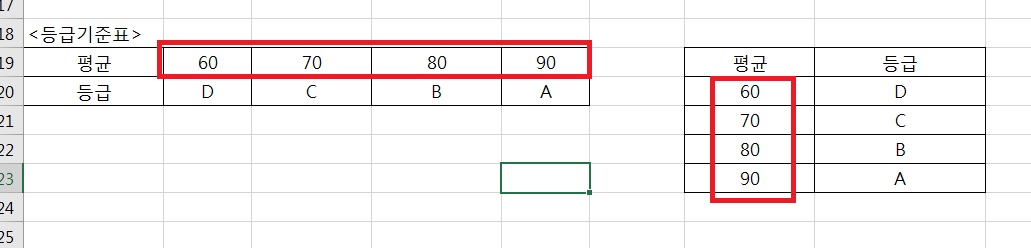 만약 [표1]에 평균 찾을 값이라고 한다면 찾을 값 부분에 이 값을 넣고 이 평균에 해당하는 등급을 구하고자 한다면 참조로 지정된 범위를 잡은 후 이 범위에서 등급에 해당하는 열이나 행을 표시 해주면 됩니다.
