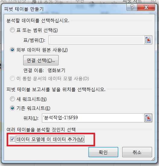 데이터 모델에 이 데이터 추가를 체크 하지 않으면 해당 메시지가 표시됩니다.
