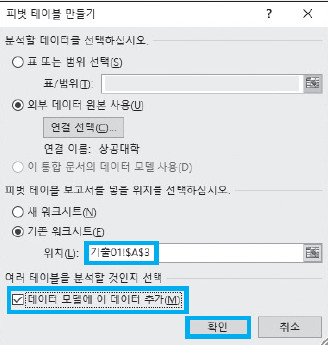 '데이터 모델에 이 데이터를 추가하시오.'라는 지시사항이 있을 때는 반드시 '피벗 테이블 만들기' 창에서 '데이터 모델에 이 데이터 추가'를 선택해야 합니다. 이것을 선택하지 않으면 연결할 수 없다는 창이 뜹니다.