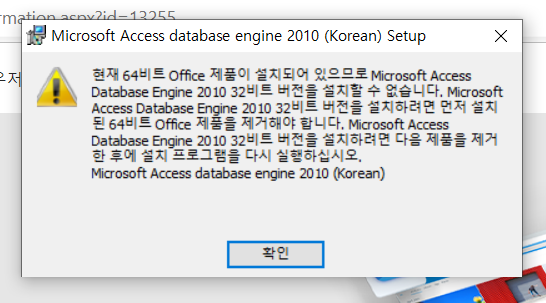 64비트 드라이버 설치 후에도 같은 문제가 발생한다면 32비트용 AccessDatabaseEngine.exe 를 다운받아