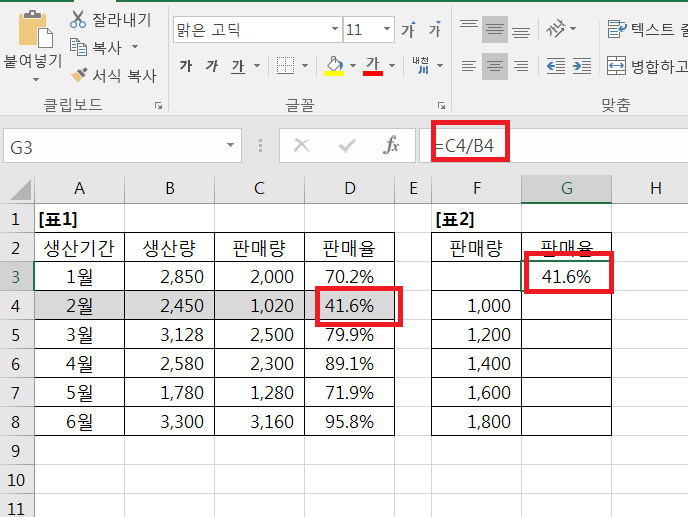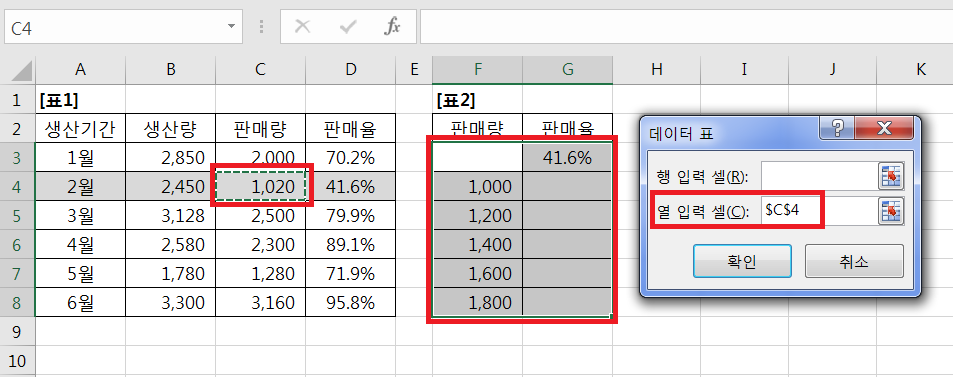 데이터 표의 식은 행과 열이 만나는 곳에 작성하는 것입니다.