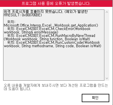 해당 오류는 윈도우 환경 문제로 비주얼 베이직 쪽에서 오류가 발생한 것으로 보이며,