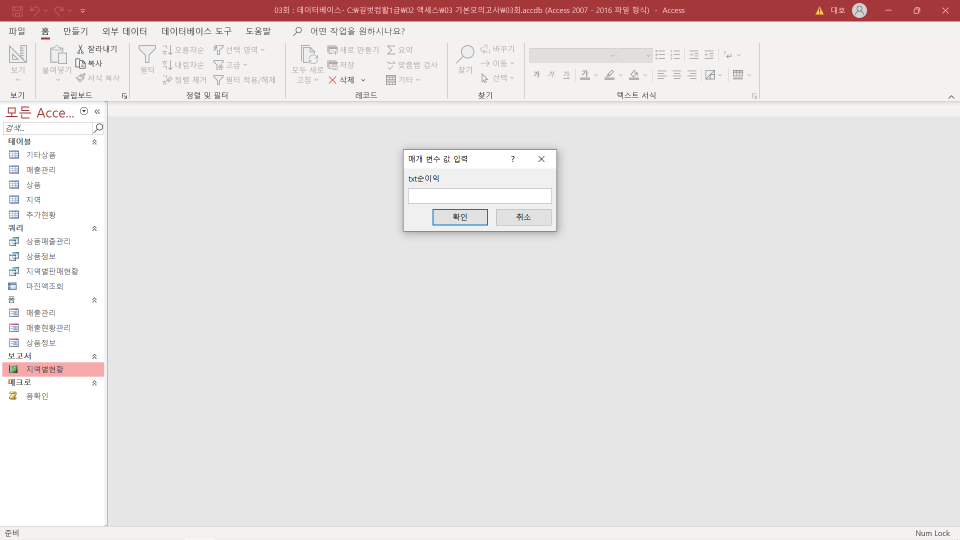 계속 보고서를 열때 매개 변수 값을 입력하라고 아래와 같이 뜨는데 뭘 잘못 쓴건지 모르겠습니다 ㅠㅠ