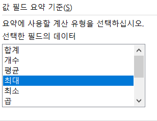 갑 필드 설정을 최대값으로 하라고 되어있는데 제 엑셀 상에는 최대, 최소 라고만 나옵니다.