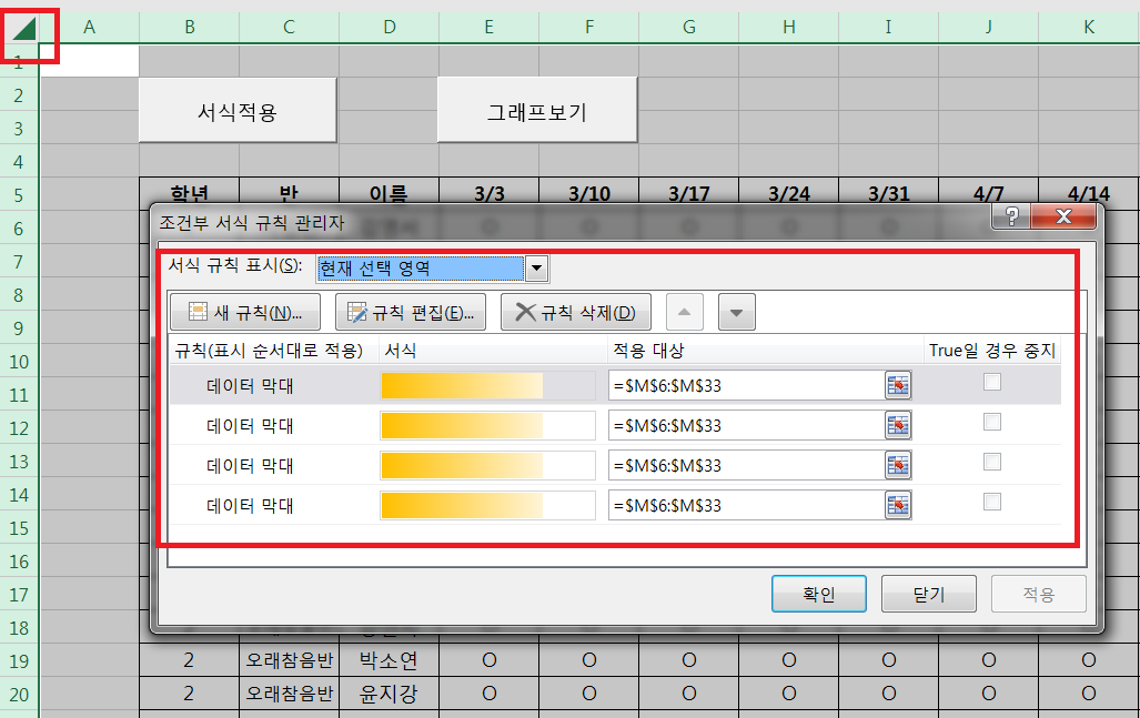 아래 그림과 같이 셀을 전체 선택한 후 조건부 서식을 확인 해 보면 여러개의 조건부 서식이 표시됩니다.