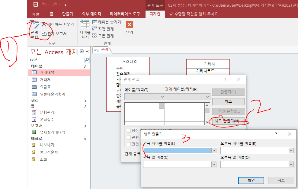 1) 우선 아래와 같이 관계편집을 클릭하고, 새로만들기를 클릭하여 나타나는 대화상자에서 해당 테이블과 필드를 각각 선택해줄 수 있습니다.