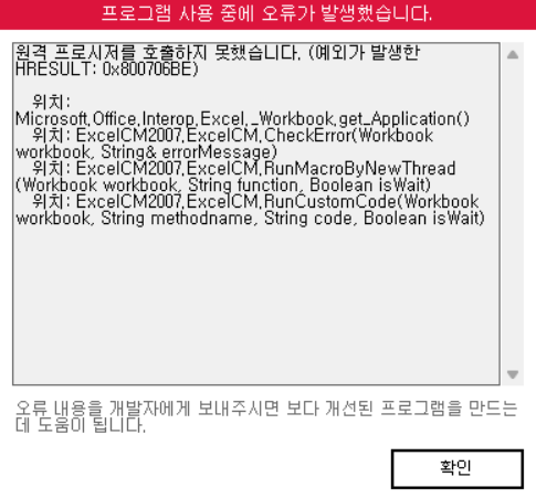 0x800706be 오류는 윈도우 환경 문제로 비주얼 베이직 쪽에서 오류가 발생한 것으로 보여집니다.