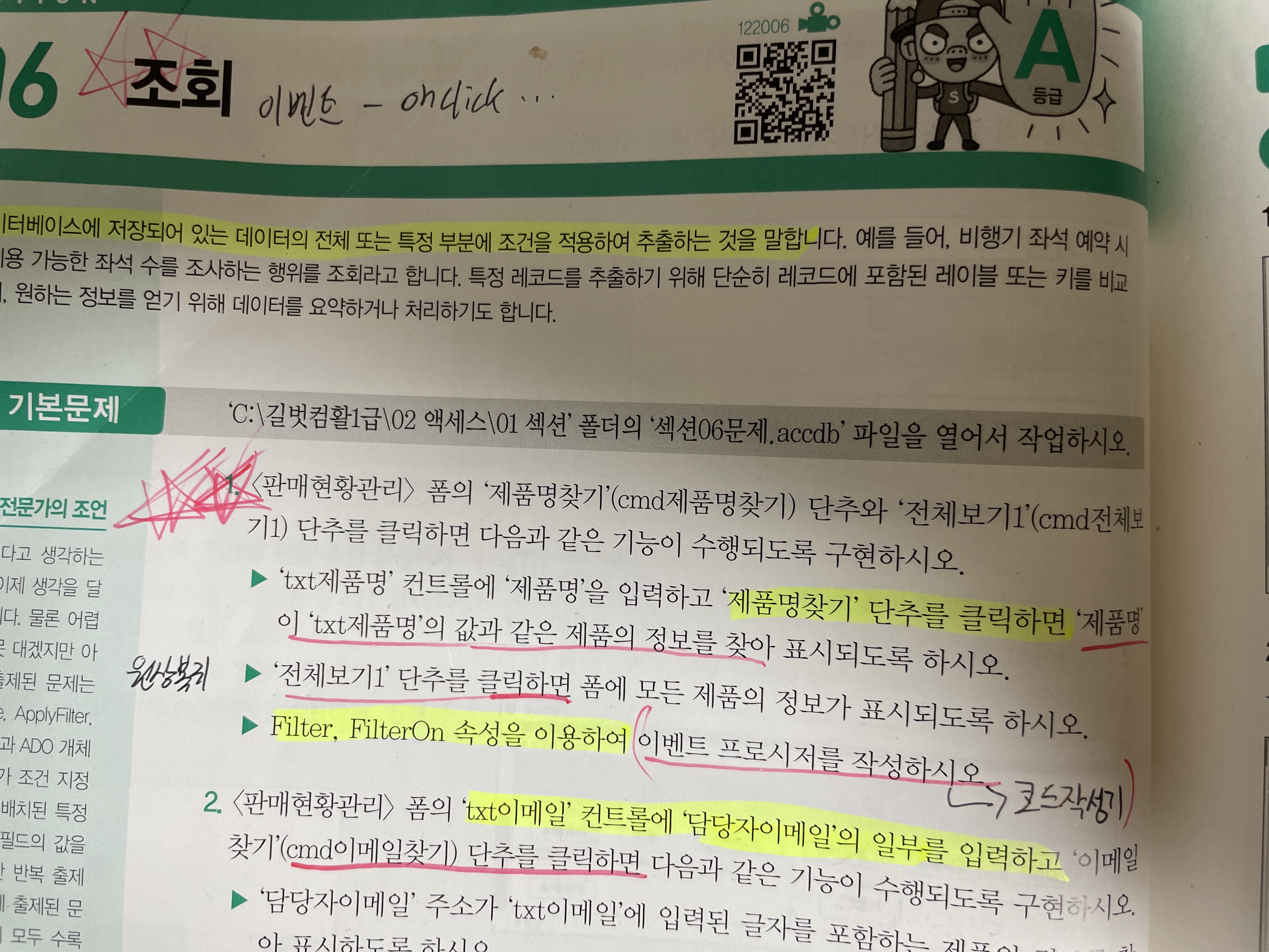 문제에는' txt제품명' 컨트롤에 '제품명'을 입력하고 '제품명찾기' 단추를 클릭하면 '제품명'이 txt제품명의 값과 같은 제품의 정보를 찾아 표시되도록 하시오라고 되어있습니다