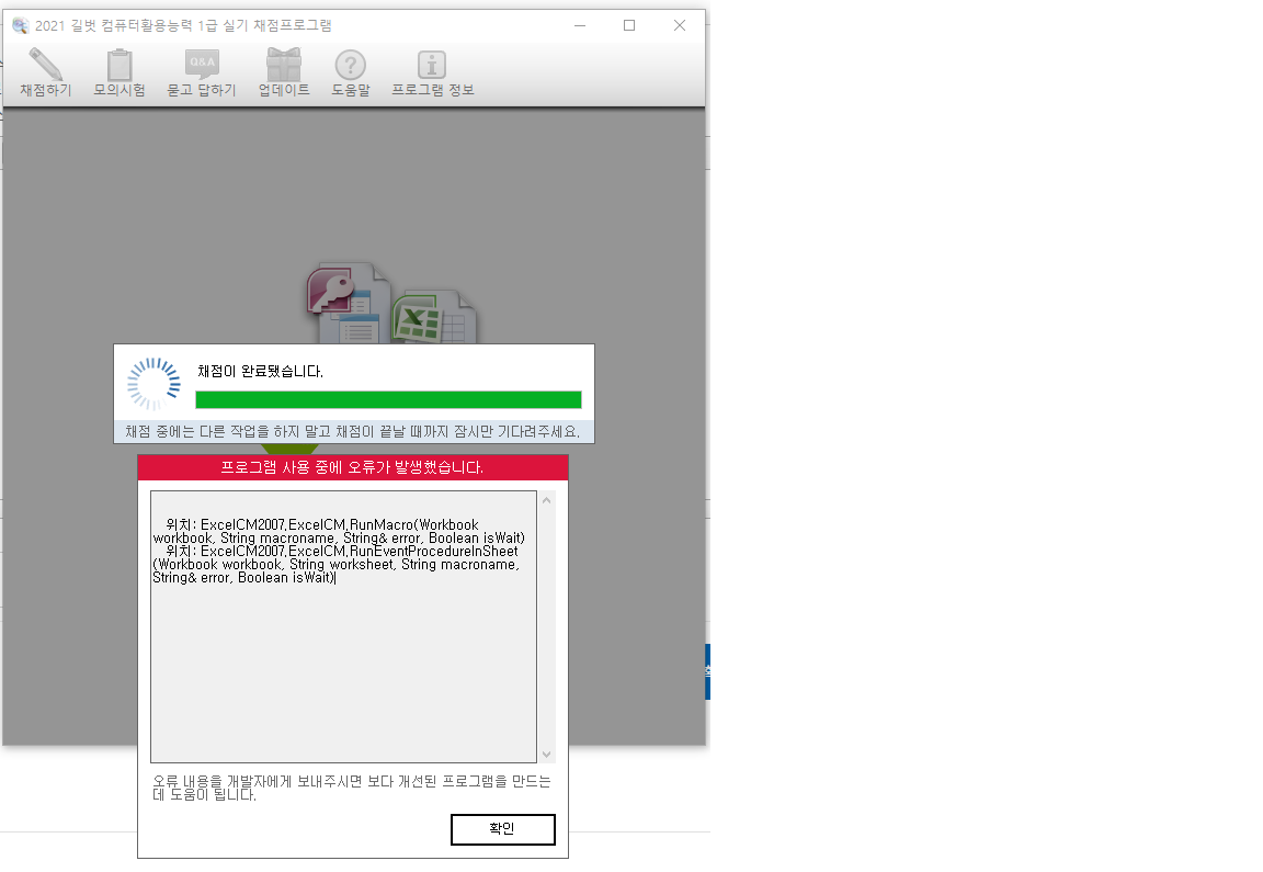 첫 채점시 채점이 정상적으로 이루어졌으나 매크로 채점이 이루어지지 않아 문의게시판에 게시된 내용 그래로 한 후 채점프로그램을 실행하니 해당 오류가 발생하였습니다