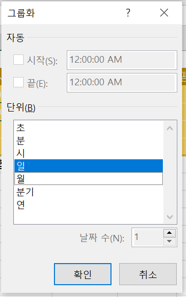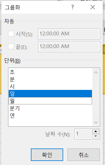 응시날짜 셀 우클릭 한 후 그룹화 대화상자