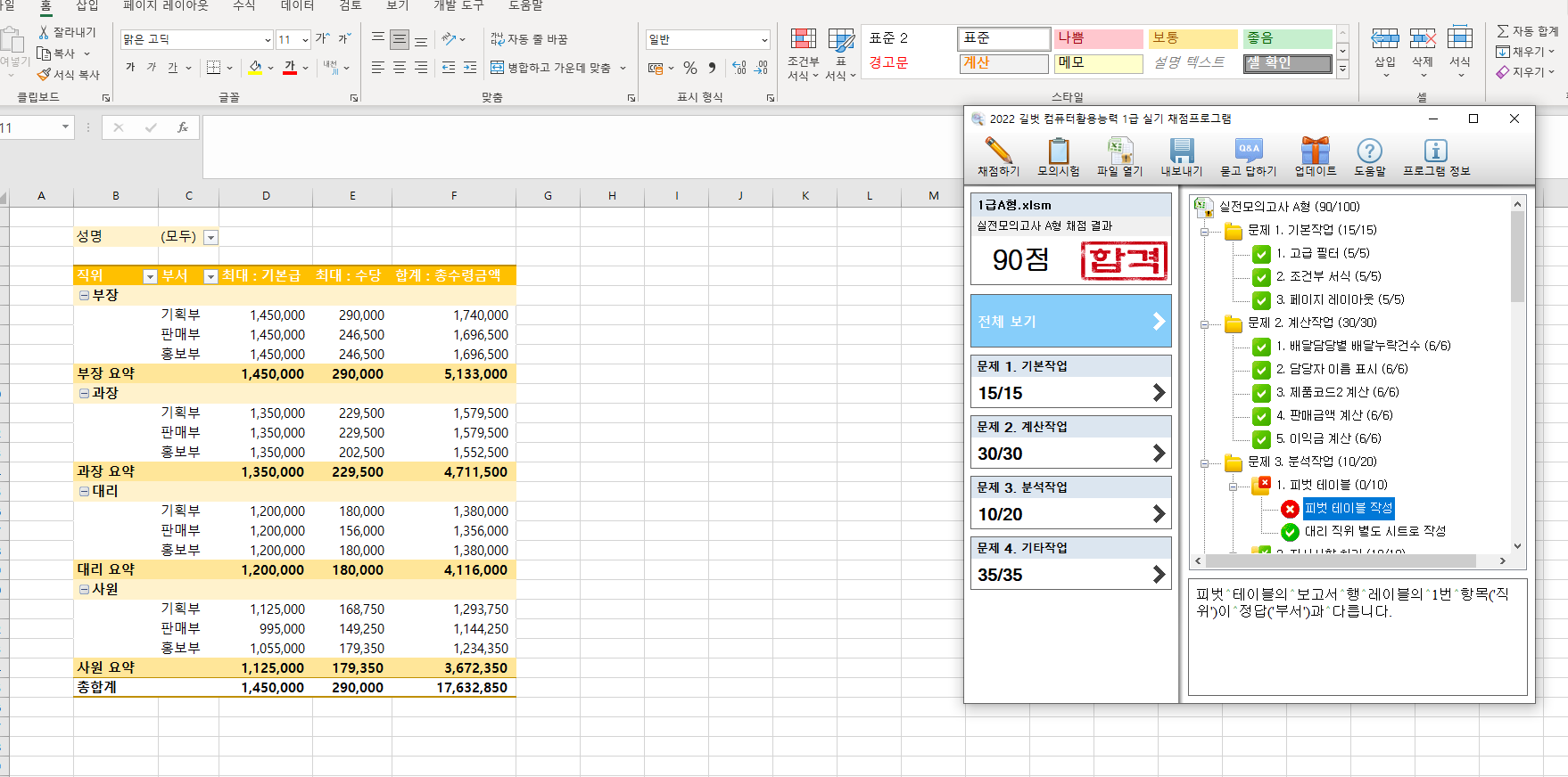 교재의 피벗테이블 완성 사진에 행레이블의 순서가 직위-부서로 되어있어서 똑같이 만들었는데, 채점프로그램에는 부서테이블이 먼저라고 틀렸다고 나오네요