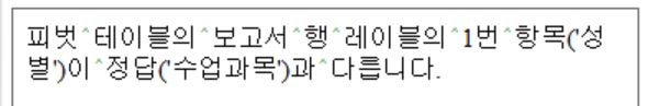 1. 분석작업 1에서 주어진 피벗테이블 그림과 같이 설정하였는데 아래와 같이 틀렸다고 뜹니다. 문제에서 주어진 피벗테이블도 행 레이블의 1번 항목이 성별인데 혹시 채점이 잘못 된 것은 아닐까요?