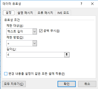 분석작업 데이터유효성검사에서 글자길이를 4글자로 제한하라고했는데 이렇게한건 틀린거로 채점되나요?