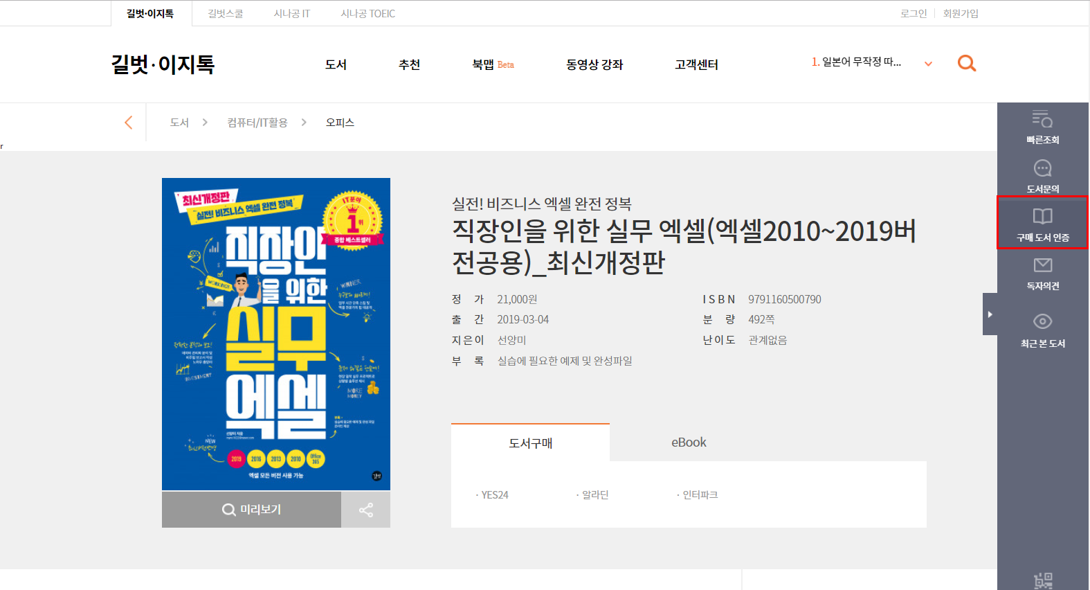 2. 도서상세페이지의 오른쪽에서 3번째에 있는 퀵메뉴에서 '구매도서인증' 을 클릭합니다.