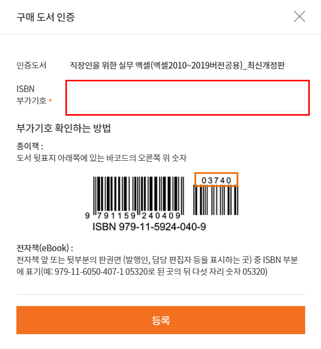 4. ISBN부가기호(도서 뒷표지 바코드의 오른쪽 위 숫자 ) 를 입력한 후 확인 을 눌러주면 구매인증 완료.