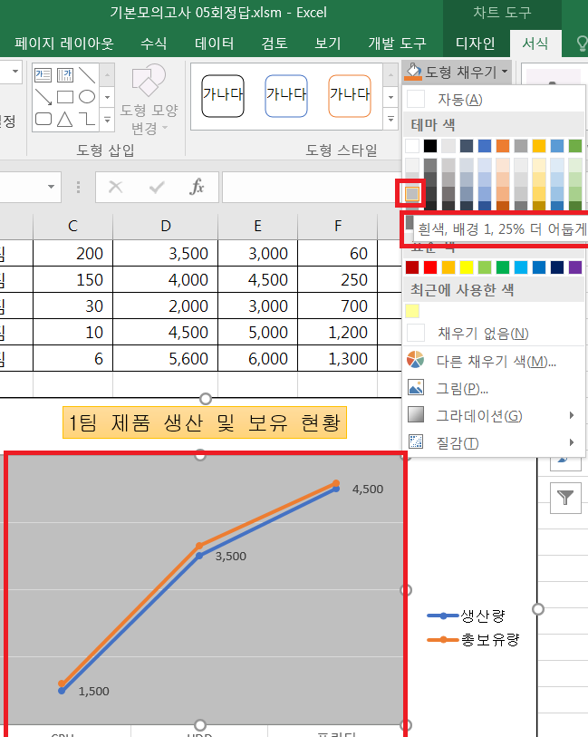 차트 도구→서식→도형스타일→도형채우기에서 (흰색, 배경1, 25%더 어둡게)를 선택하라고 했는데 도저히 괄호 친 부분을 어떻게 작업해야 할지 모르겠습니다. 어디를 눌러야 괄호 친 설정을 할 수 있는 건가요?