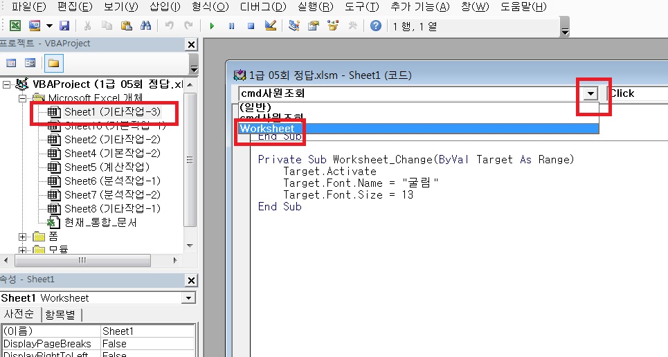 아래 그림과 같이 기타작업-3 시트를 더블클릭 한 후 나타나는 프로시저 창에서 worksheet를 선택한 후 옆의 콤보상자에서 change 을 선택하세요.