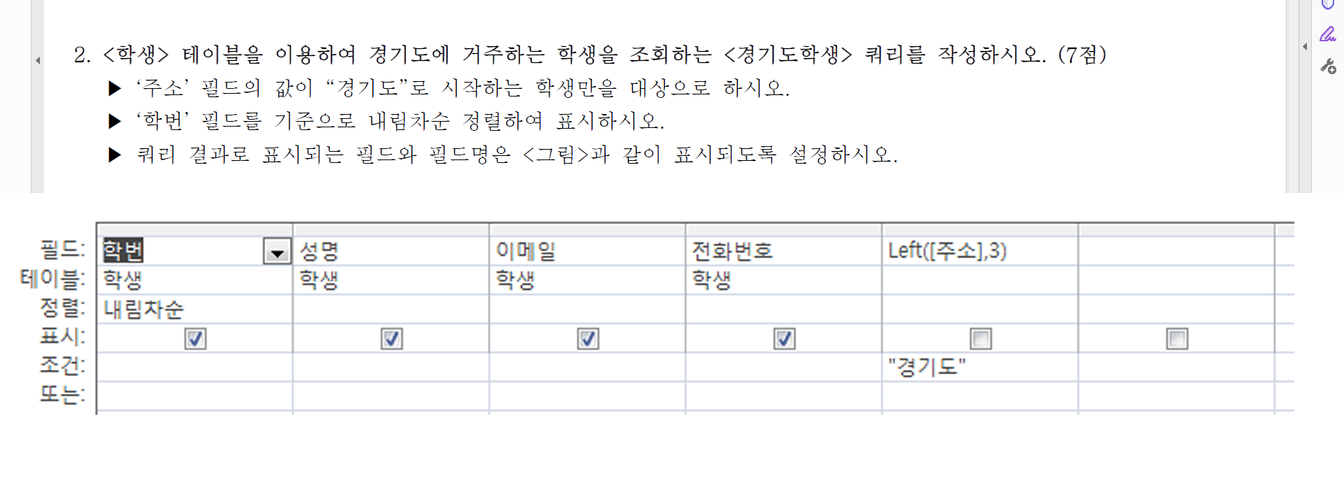 해설지에는 조건식이 Like "*경기도*" 로 풀이되어 있으나, "경기도" 라는 값을 단순히 포함하는 것이 아닌 "경기도" 로 시작한다고 명시하였기에 Left 함수를 활용하여 풀이한 화면입니다.