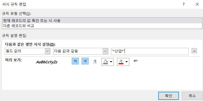 '상호'에 "산업"이 포함된 레코드에 대해 글꼴 '굵은 기울임꼴'로 지정