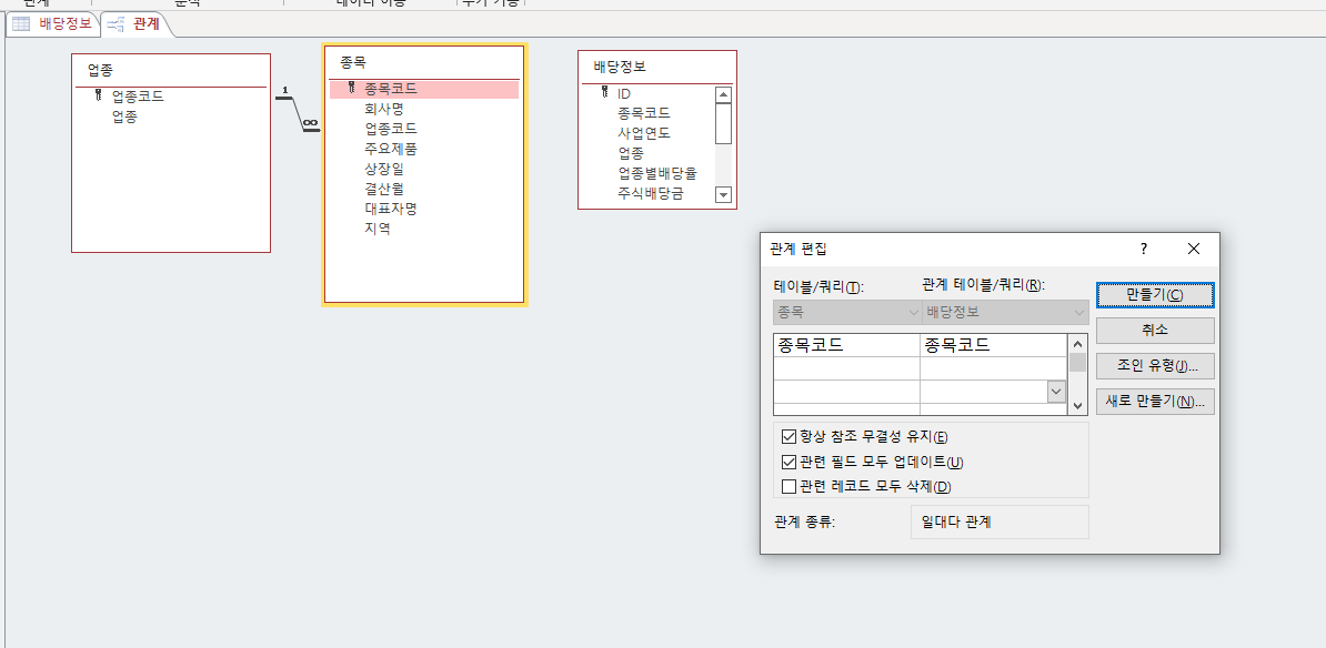 테이블 관계 설정에서 만들기 버튼안눌러져요