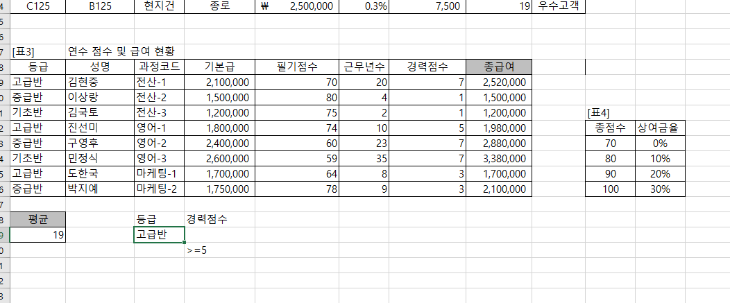 등급을 "고급반"으로 입력했을 때는 오류로 인식해서, 경력점수가 >=5인 조건에만 해당하는 평균을 구하기 때문입니다.