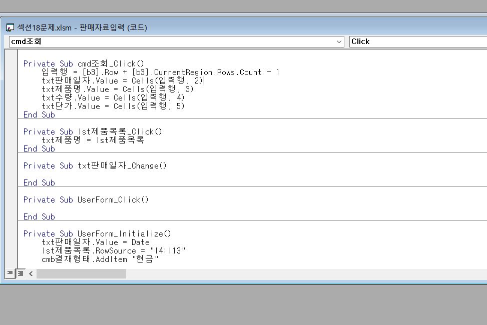 컴활1급 실기 엑셀 244p 프로시저 cmd조회 문제와 관련해 질문이 있습니다.