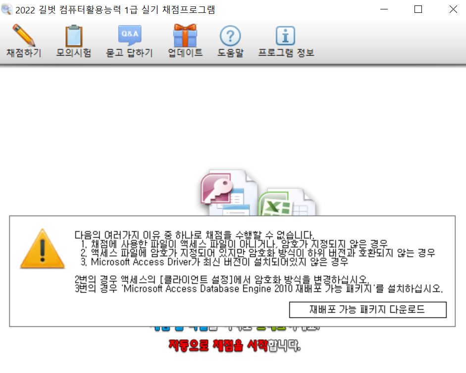 1.채점에 사용한 파일이 액세스 파일이 아니거나 암호가 지정되지 않은경우 -> 엑세스파일이고 암호지정되있음