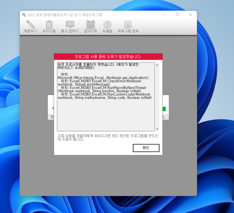 *해당 오류는 윈도우 환경 문제로 비주얼 베이직 쪽에서 오류가 발생한 것으로 보여집니다.