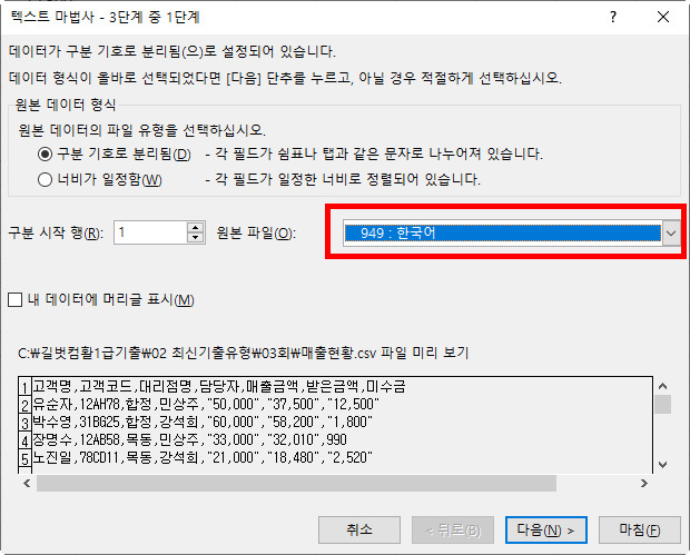 아래 텍스트 마법사 대화상자에서 원본 파일을 '한국어'로 변경해 주면 됩니다.