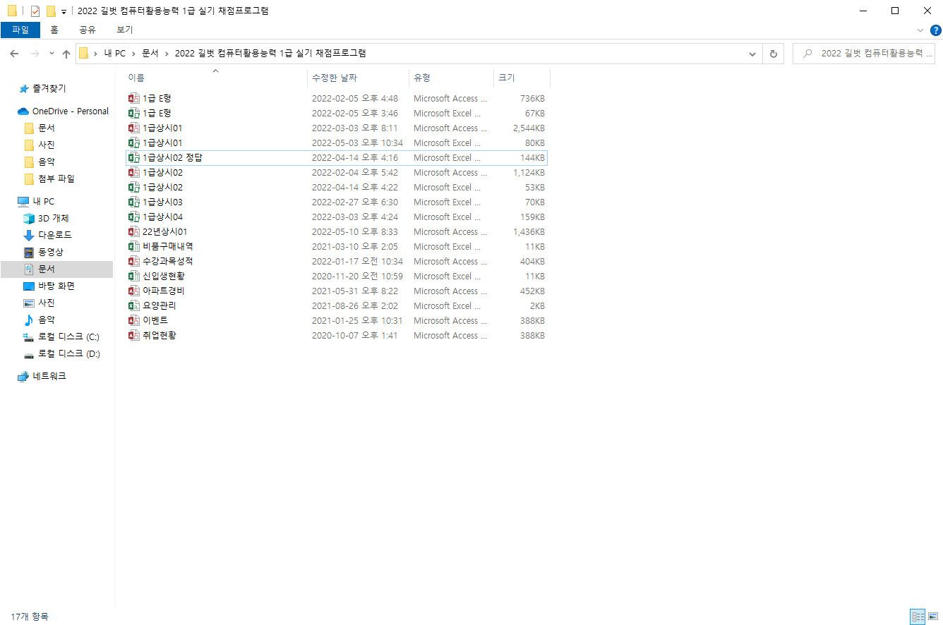 엑세스 부분은 22년 상시 01로 잘뜨고 있는 반명 엑설은 문제지에 있는 21 상시 01을 덮어쓰고 있으며 22년 상시 02는 정답파일로 뜨고 있습니다.