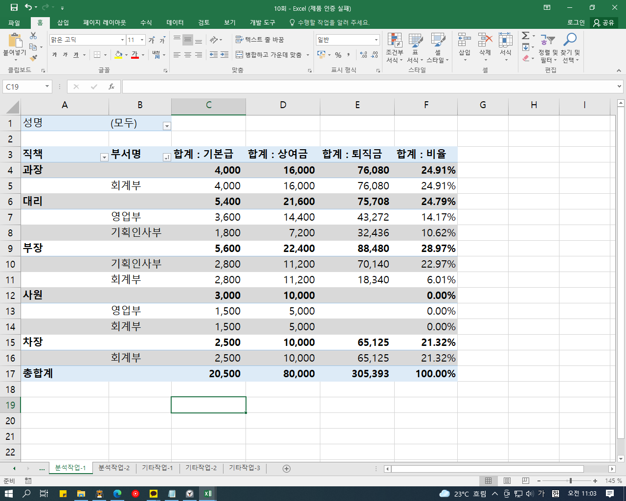 그런데 피벗테이블을 다 만들고나면 영업부가 기획인사부보다 위에 있습니다